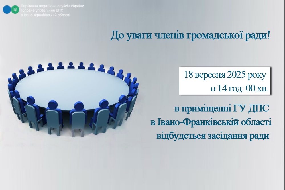 18 вересня 2025 року о 14 год. 00 хв. в каб. 501 відбудеться засідання Громадської ради при Головному управлінні ДПС в Івано-Франківській області.