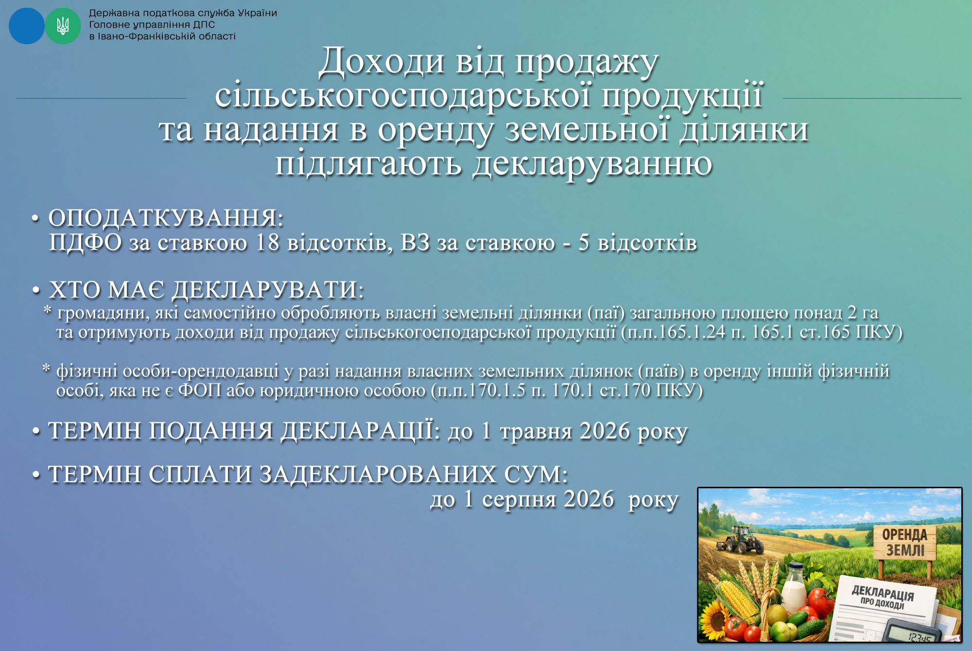 Деклараційна кампанія 2026: Доходи від продажу сільськогосподарської продукції та надання в оренду земельної ділянки підлягають декларуванню