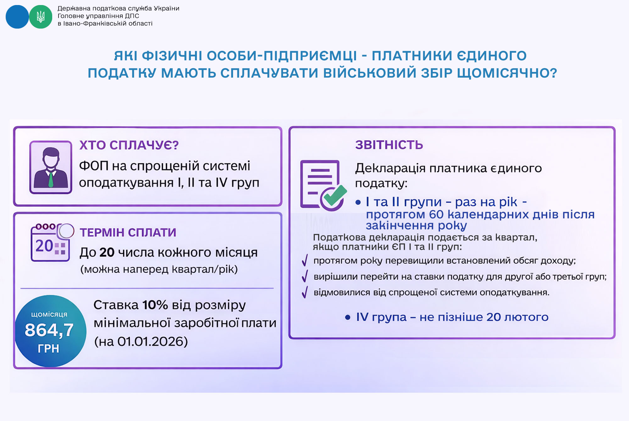 Листівка "Як фізичні особи-підприємці - платники єдиного податку мають сплачувати військовий збір"