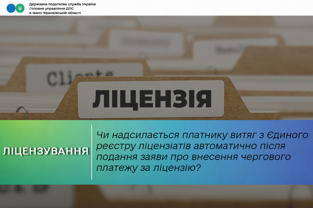 Після отримання Заяви та її опрацювання, орган ліцензування автоматично формує витяг із Єдиного реєстру ліцензіатів з виробництва та обігу спирту етилового, спиртових дистилятів, алкогольних напоїв, тютюнових виробів, тютюнової сировини та рідин, що використовуються в електронних сигаретах / Єдиного реєстру ліцензіатів та місць обігу пального і надсилає його суб'єкту господарювання в електронній формі.