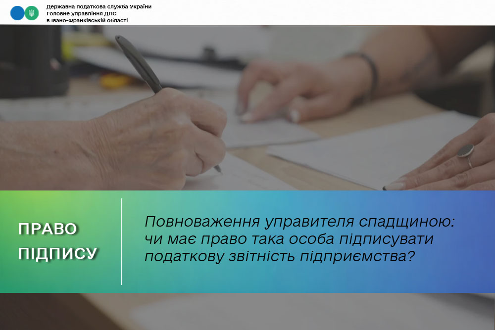Отже, у разі смерті засновника юридичної особи, який був єдиною відповідальною особою підприємства (директор / бухгалтер), особа, яка управляє спадщиною відповідно до укладеного договору на управління спадщиною, є відповідальною за подання податкової звітності, тому має право підписувати її та подавати до органів ДПС, як керівник юридичної особи, лише після внесення відповідних змін до ЄДР.