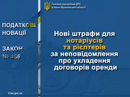 Головне управління ДПС в Івано-Франківській області повідомляє, що Законом України від 16.01.2020 №466-ІХ «Про внесення змін до Податкового кодексу України щодо вдосконалення адміністрування податків, усунення технічних та логічних неузгодженостей у податковому законодавстві» введено нові штрафи для нотаріусів та рієлтерів за неповідомлення про укладення договорів оренди.