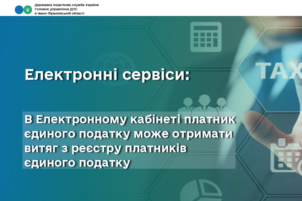 В Головному управлінні ДПС в Івано-Франківській області звертають увагу, що за бажанням зареєстрований платник єдиного податку може безоплатно та безумовно отримати (у тому числі в електронному вигляді) витяг з реєстру платників єдиного податку (далі – витяг) у контролюючому органі за місцем податкової адреси. Це зазначено у п. 299.9 ст. 299 Податкового кодексу України від 02 грудня 2010 року № 2755-VI зі змінами та доповненнями (далі – ПКУ).