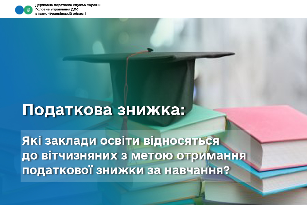 В Головному управлінні ДПС в Івано-Франківській області інформують, що відповідно до п.п. 166.3.3 п. 166.3 ст. 166 Податкового кодексу України платник податку має право включити до податкової знижки у зменшення оподатковуваного доходу платника податку за наслідками звітного податкового року, визначеного з урахуванням положень п. 164.6 ст. 164 ПКУ, фактично здійснені ним протягом звітного податкового року витрати у вигляді суми коштів, сплачених платником податку на користь вітчизняних закладів дошкільної, позашкільної, загальної середньої, професійної (професійно-технічної) та вищої освіти для компенсації вартості здобуття відповідної освіти таким платником податку та/або членом його сім’ї першого ступеня споріднення та/або особи, над якою встановлено опіку чи піклування, або яку влаштовано до прийомної сім’ї, дитячого будинку сімейного типу, якщо такого платника податку призначено відповідно опікуном, піклувальником, прийомним батьком, прийомною матір’ю, батьком-вихователем, матір’ю-вихователькою.