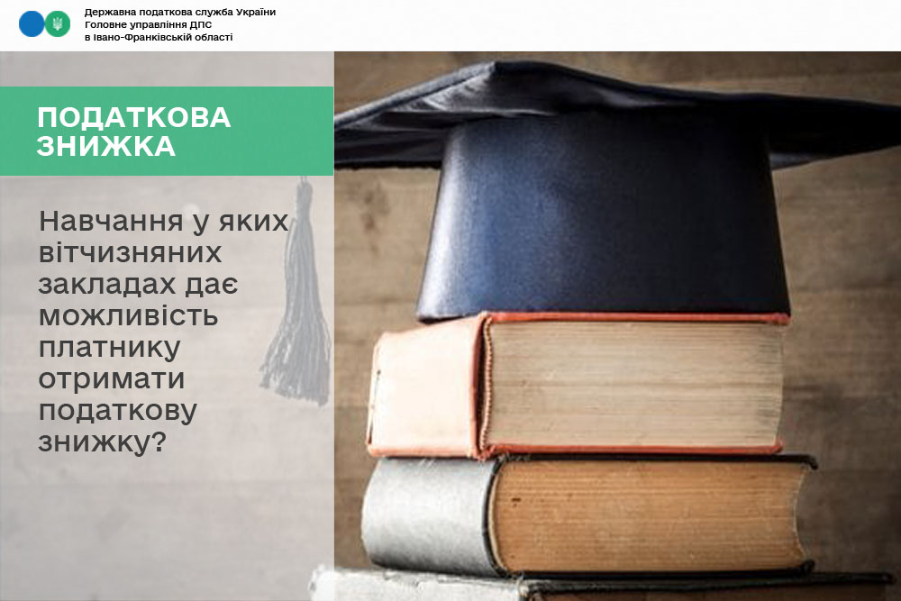 Таким чином, з метою отримання податкової знижки за навчання до вітчизняних відносяться заклади дошкільної, позашкільної, загальної середньої, професійної та вищої освіти, основним видом діяльності яких є освітня діяльність. Типи закладів дошкільної, позашкільної, загальної середньої, професійної та вищої освіти визначено спеціальними законами.
