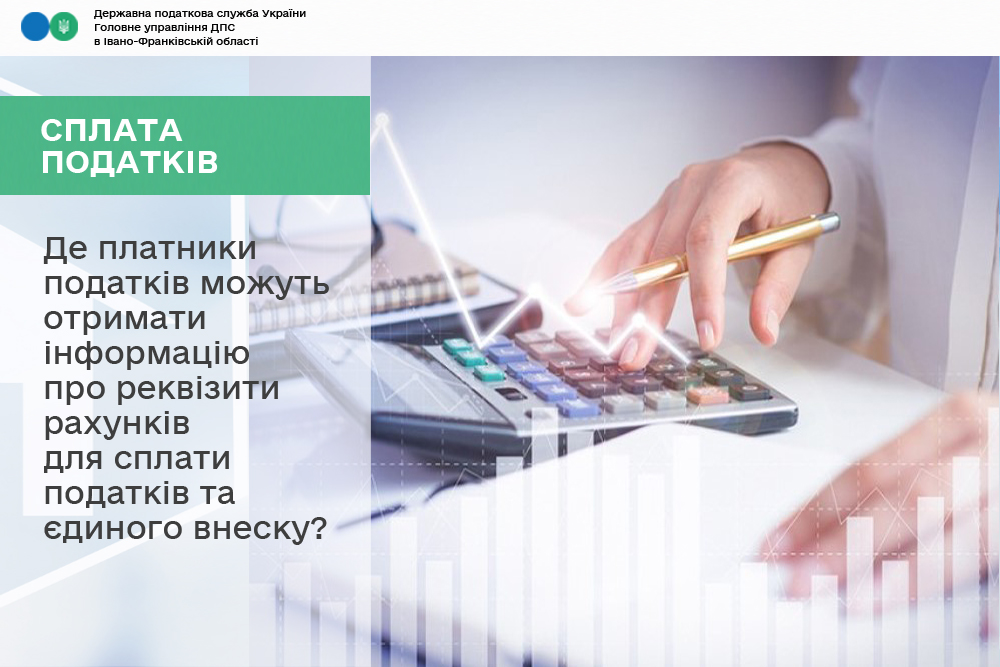 В Головному управлінні ДПС в Івано-Франківській області нагадують платникам податків, що інформацію про реквізити рахунків, відкритих для зарахування податків, а також для сплати єдиного внеску платники податків можуть отримати у рубриці «Рахунки для сплати платежів» на вебпорталі ДПС.