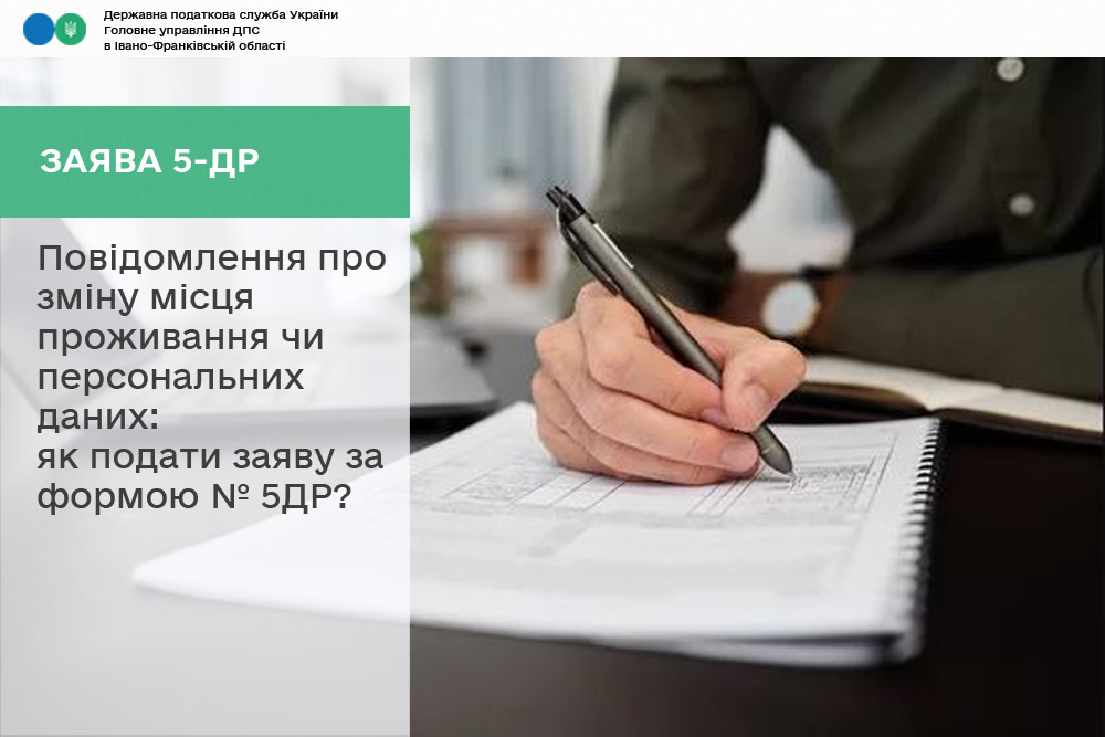 В Головному управлінні ДПС в Івано-Франківській області нагадують, що фізична особа – платник податків у разі зміни місця проживання, перейменування назви міста чи вулиці, зміни податкової адреси, імені або прізвища зобов’язана повідомити про це органи податкової служби шляхом подання заяви за ф. № 5ДР.