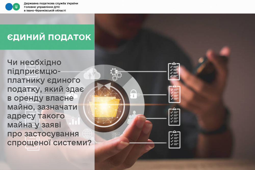 Чи необхідно підприємцю-платнику єдиного податку, який здає в оренду власне нерухоме майно, зазначати адресу такого майна у заяві про застосування спрощеної системи?