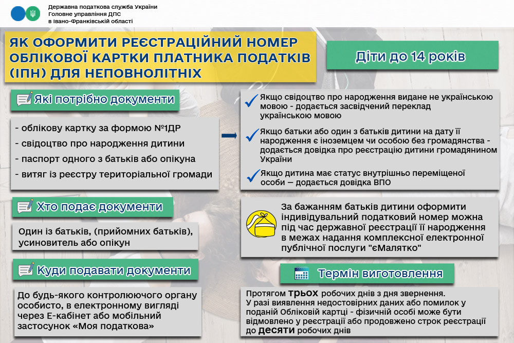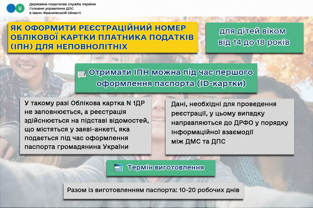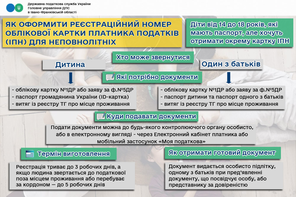 Листівка "Як оформити реєстраційний номер облікової картки платника податків (ІПН) для неповнолітніх"
