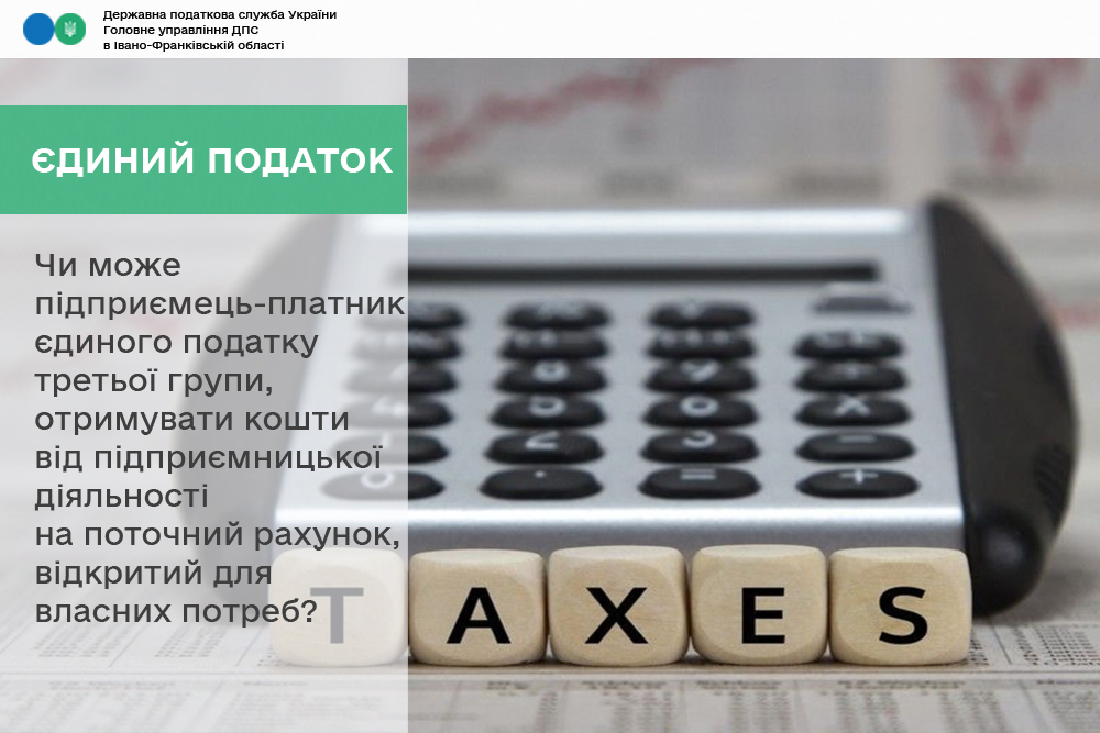 При цьому зазначаємо, що для проведення операцій, пов’язаних із здійсненням підприємницької діяльності, фізична особа – підприємець – платник єдиного податку (першої – третьої груп) не може використовувати поточний рахунок фізичної особи, що відкривається нею для власних потреб.