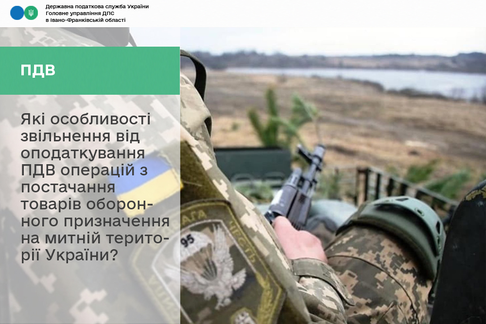 В Головному управлінні ДПС в Івано-Франківській області інформують, що операції з постачання на митній території України товарів оборонного призначення підлягають звільненню від оподаткування ПДВ згідно з п.п. 4 п. 32 підрозд. 2 розд. XX Податкового кодексу України за умови, що: