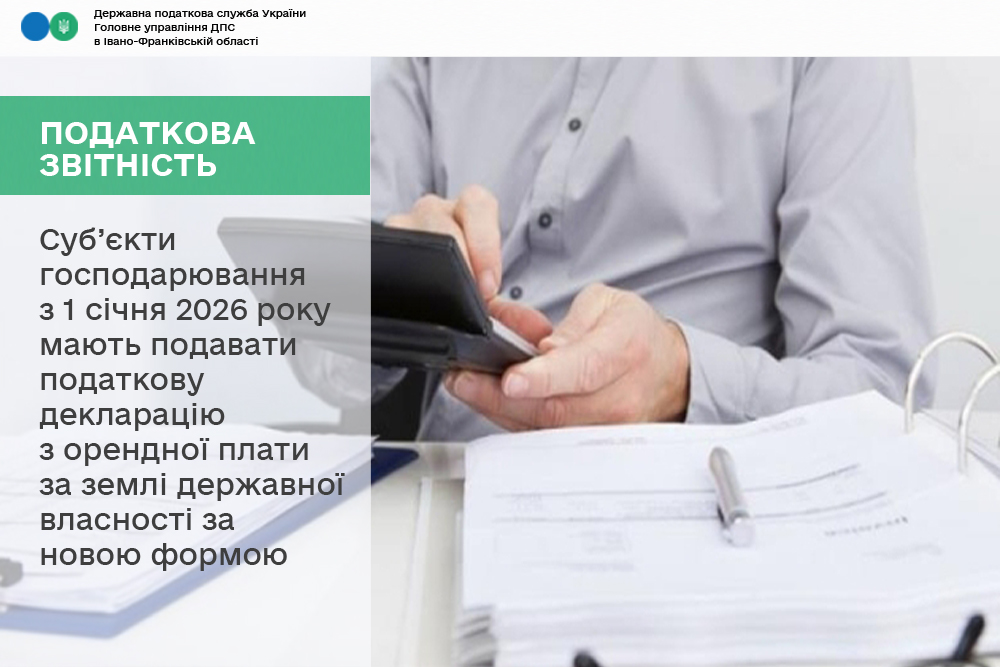 В Головному управлінні ДПС в Івано-Франківській області повідомляють, що з 1 січня 2026 року запроваджується нова форма податкової декларації з орендної плати для земельних ділянок сільськогосподарського призначення державної власності. Її застосовуватимуть суб’єкти господарювання, які користуються ділянками, переданими в оренду згідно зі статтею 120¹ Земельного кодексу України.