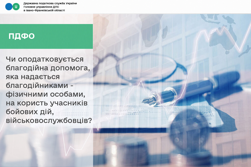 В Головному управлінні ДПС в Івано-Франківській області нагадують, що підпунктом 170.7.8 пункту 170.8 статті 170 Кодексу 170.7.8.визначено умови звільнення від оподаткування благодійної допомоги, яка надається благодійниками - фізичними особами, на користь учасників бойових дій, військовослужбовців. Зокрема, благодійна допомога на користь учасників бойових дій не оподатковується за умови, що сума (вартість) отриманої благодійної допомоги витрачається учасниками бойових дій військовослужбовцями (резервістами, військовозобов’язаними) виключно: для закупівлі або у вигляді спеціальних засобів індивідуального захисту (касок, бронежилетів, виготовлених відповідно до військових стандартів), технічних засобів спостереження, лікарських засобів, засобів особистої гігієни, продуктів харчування, предметів речового забезпечення чи інших товарів (робіт, послуг) за переліком, що визначається Кабінетом Міністрів України, чи для оплати (компенсації) вартості лікарських засобів, донорських компонентів, виробів медичного призначення, технічних та інших засобів реабілітації, платних послуг з лікування (обстеження, діагностики), забезпечення виробами медичного призначення, технічними та іншими засобами реабілітації, послуг медичної реабілітації, санаторно-курортного оздоровлення.