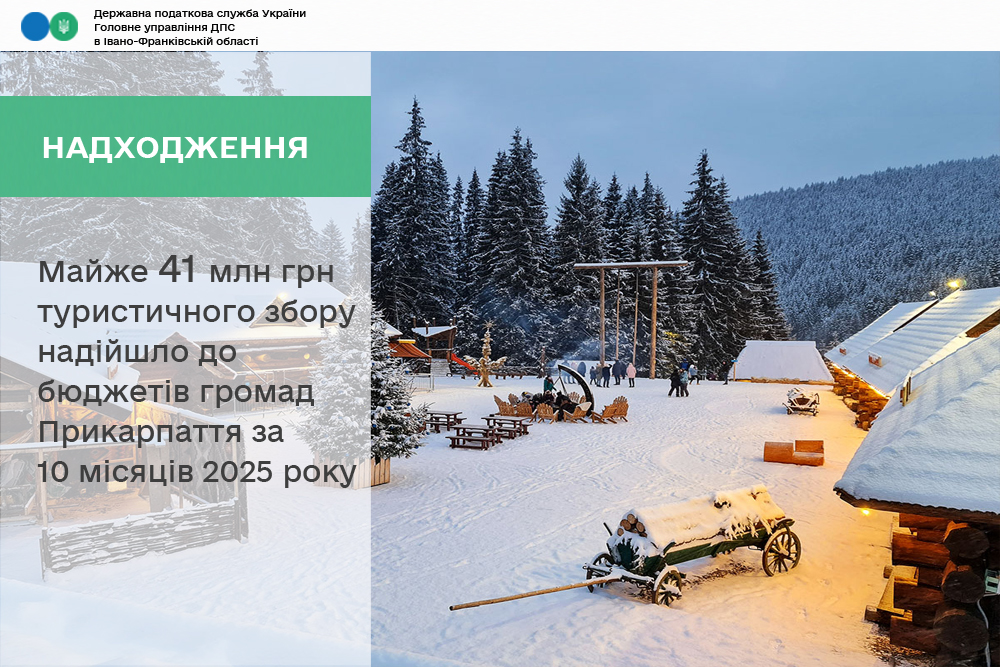 Так, за січень – жовтень 2025 року суб’єкти господарювання, які здійснюють діяльність у сфері туристичного бізнесу сплатили до місцевих бюджетів Івано-Франківщини 40,7 мільйона гривень туристичного збору, що на 14,3 мільйона гривень більше, ніж торік.