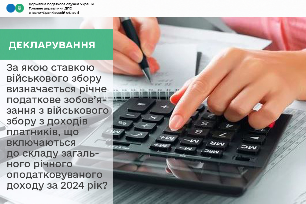 Згідно з абзацом першим п.п. 1.16 п. 16 прим. 1 підрозд. 10 розд. XX «Перехідні положення» ПКУ річне податкове зобов’язання з військового збору з доходів платників, визначених п. 162.1 ст. 162 ПКУ, що включаються до складу загального річного оподатковуваного доходу за 2024 звітний (податковий) рік та остаточний розрахунок податкових зобов’язань щодо яких проводиться в поданій річній податковій декларації про майновий стан і доходи, у тому числі з іноземних доходів, визначається за ставкою військового збору у розмірі 1,5 відс. (крім випадків, передбачених абзацом третім п.п. 1.16 п. 16 прим. 1 підрозд. 10 розд. XX «Перехідні положення»).