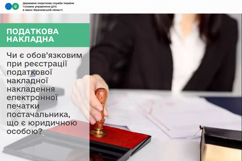 Чи є обов’язковим при реєстрації податкової накладної / розрахунку коригування накладення електронної печатки або удосконаленої електронної печатки постачальника (продавця), що є юридичною особою?