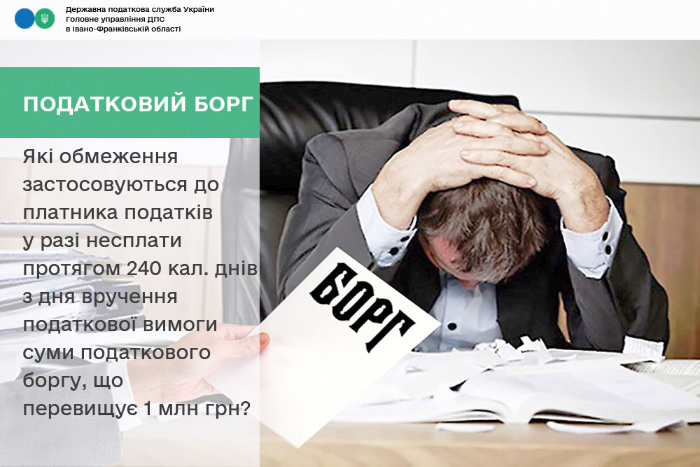 Відповідно до п. 87.13 ст. 87 глави 9 Податкового кодексу України у разі несплати протягом 240 календарних днів з дня вручення платнику податків податкової вимоги суми податкового боргу, що перевищує 1 мільйон грн., контролюючий орган може звернутися до суду за встановленням тимчасового обмеження у праві виїзду керівника юридичної особи або постійного представництва нерезидента – боржника за межі України – до погашення такого податкового боргу.