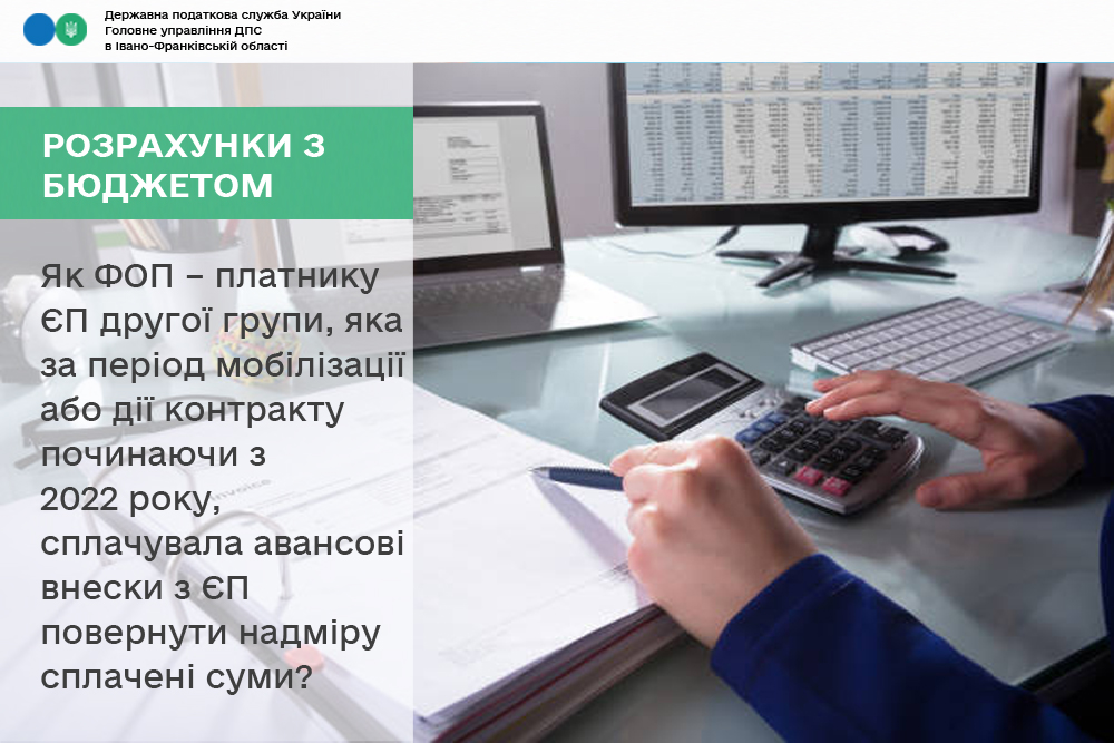 На сьогодні ДПС не отримано відомості з Єдиного державного реєстру призовників, військовозобов’язаних та резервістів про дату мобілізації, укладення контракту, демобілізації (звільнення з військової служби) самозайнятої особи, отже для вирішення питання скасування (анулювання) за відповідні періоди нарахованих авансових внесків по єдиному податку та військовому збору та як наслідок – повернення надміру сплачених сум ФОП – платник єдиного податку другої групи може звернутись до контролюючого органу за місцем податкової адреси з відповідною заявою з наданням копій підтверджуючих документів.