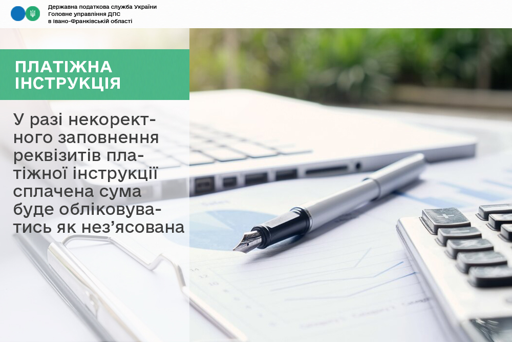 Юридичні особи, фізичні особи-підприємці та громадяни при здійсненні сплати податкових платежів та єдиного внеску заповнюють у платіжній інструкції всі обов’язкові реквізити, які визначені Інструкцією про безготівкові розрахунки в національній валюті користувачів платіжних послуг, затвердженою постановою Правління Національного банку України від 29.07.2022 №163 та Порядком заповнення реквізиту «Призначення платежу» платіжної інструкції під час сплати (стягнення) податків, зборів, митних, інших платежів, єдиного внеску на загальнообов’язкове державне соціальне страхування, внесення авансових платежів (передоплати), грошової застави, а також у разі їх повернення, затвердженим наказом Міністерства фінансів України від 22.03.2023 №148. Про це інформують в Головному управлінні ДПС в Івано-Франківській області.