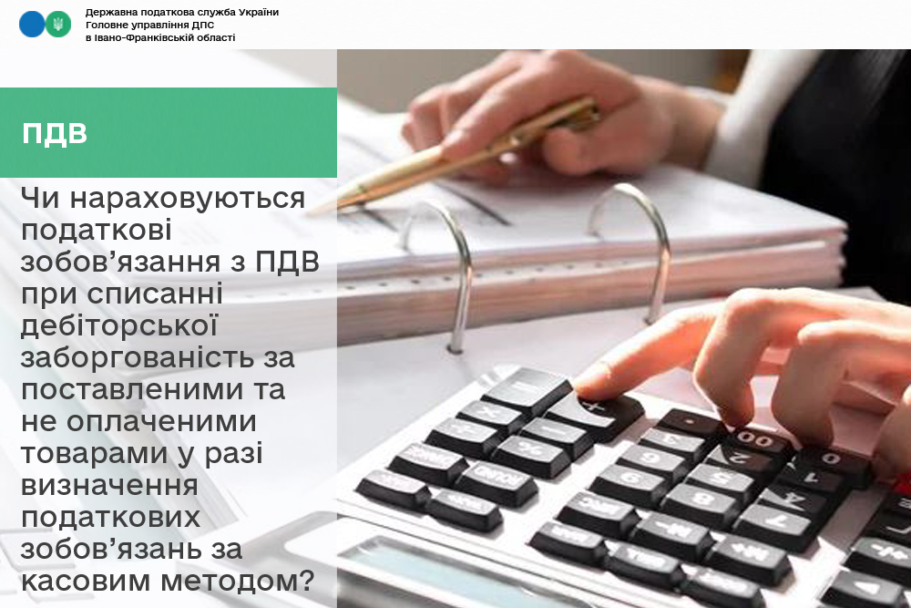 Отже, платник податку, який застосовує касовий метод визначення податкових зобов’язань, на дату списання простроченої дебіторської заборгованості за поставлені та не оплачені товари (послуги) повинен нарахувати податкові зобов’язання з ПДВ за операцією з постачання таких товарів (послуг).