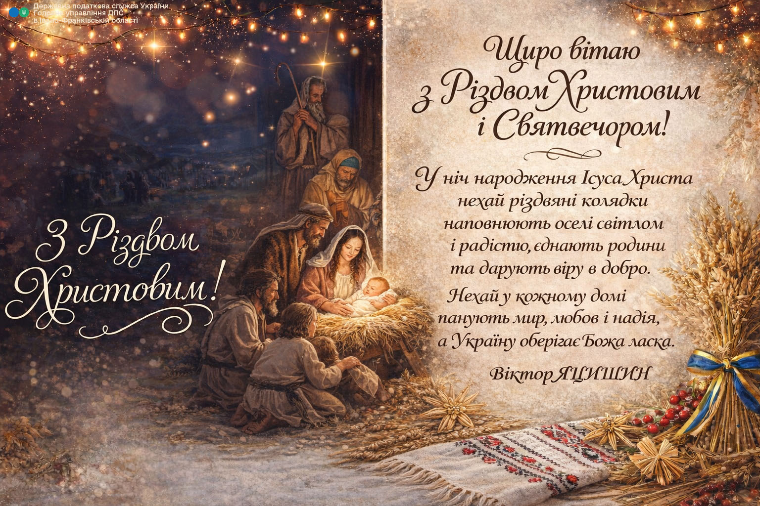 Привітання начальника Головного управління ДПС в Івано-Франківській області Віктора Яцишина з Різдвом Христовим і Святвечором!