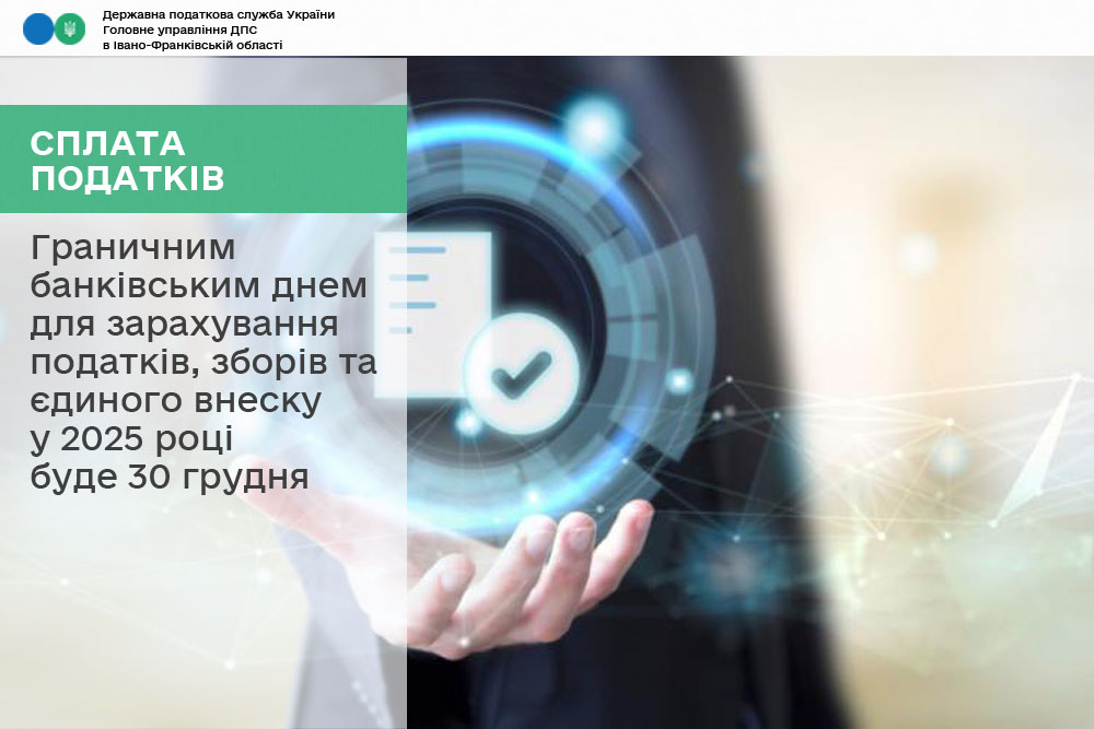 В Головному управлінні ДПС в Івано-Франківській області інформують платників податків, що останнім банківським днем для зарахування податків, зборів та сум єдиного внеску у 2025 році буде 30 грудня поточного року. Це передбачено у Регламенті роботи органів Казначейства, в період завершення бюджетного 2025 року та початку 2026 року, затверджений наказом Державної казначейської служби України від 03.12.2025 № 296.