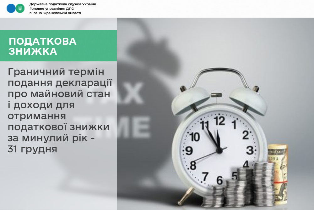 Декларацію про майновий стан і доходи для отримання податкової знижки за минулий рік громадяни можуть подати не пізнівше 31 грудня п.р до контролюючого органу, в якому перебувають на обліку. Таке право діє лише протягом одного податкового року і не переноситься на наступні роки. Про це нагадують в Головному управлінні ДПС в Івано-Франківській області.