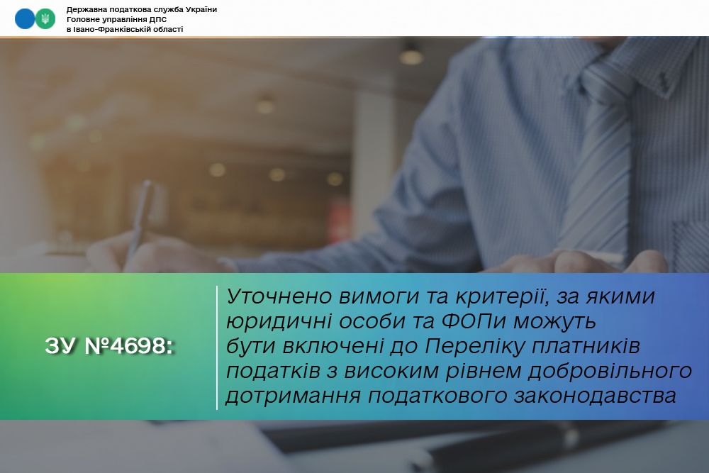 В Головному управлінні ДПС в Івано-Франківській області повідомляють, що з 1 січня п.р. набули чинності норми, визначені у Законі України від 03 грудня 2025 року № 4698- ІХ «Про внесення змін до Податкового кодексу України та інших Законів України щодо особливостей оподаткування банків податком на прибуток підприємств у 2026 році та перенесення строків введення в дію електронної системи обігу алкогольних напоїв, тютюнових виробів та рідин, що використовуються в електронних сигаретах». Законом уточнено вимоги та критерії, за якими юридичні особи та ФОПи можуть бути включені до платників податків з високим рівнем добровільного дотримання законодавства.
