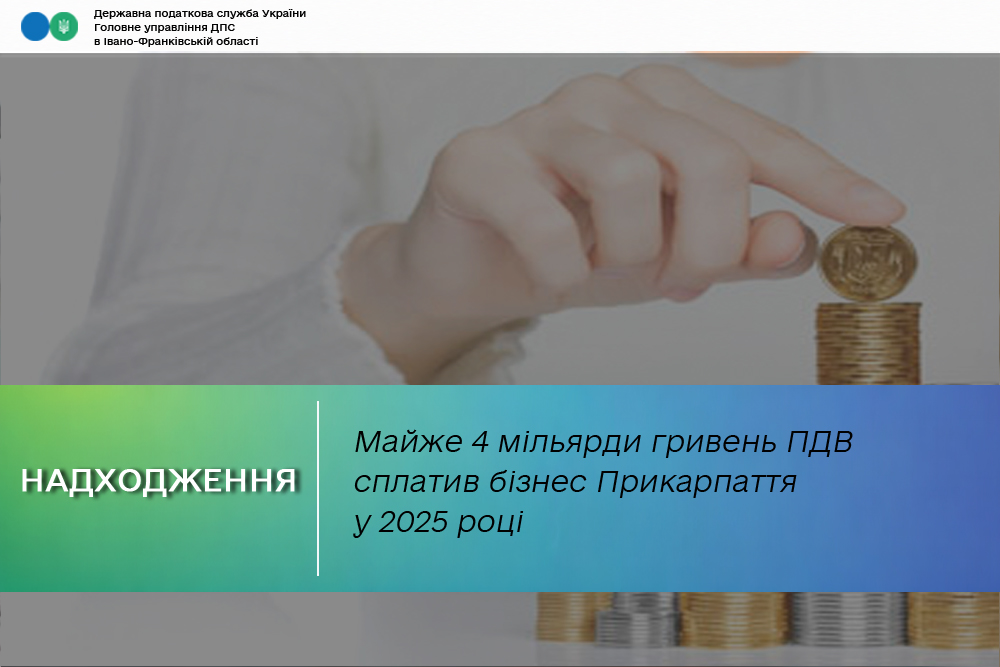 Протягом січня-грудня 2025 року суб’єкти господарювання Івано-Франківщини перерахували до державного бюджету 3,96 мільярда гривень податку на додану вартість. Порівняно з 2024 роком надходженнями ПДВ збільшилися на 788,9 мільйона гривень. Про це повідомили в Головному управлінні ДПС в Івано-Франківській області.