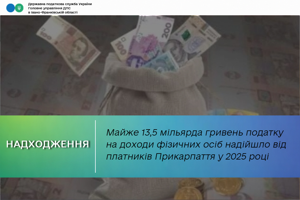 За підсумками 2025 року платники податків Прикарпаття сплатили до бюджетів усіх рівнів майже 13,5 мільярди гривень податку на доходи фізичних осіб, що на 1,7 мільярди гривень більше порівняно з аналогічним періодом минулого року. Про це інформують в Головному управлінні ДПС в Івано-Франківській області.
