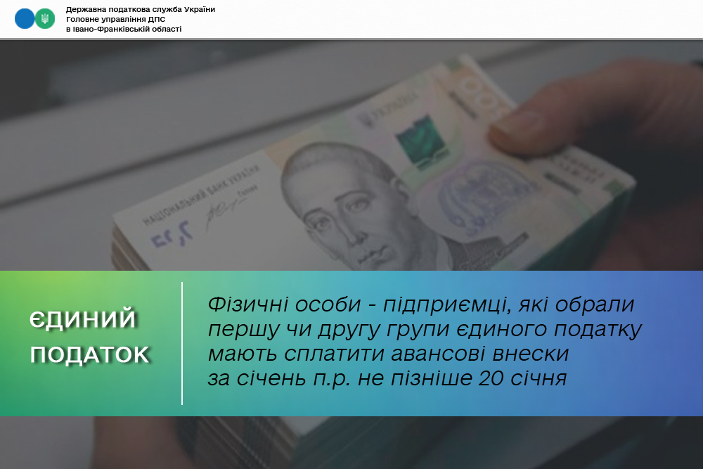 В Головному управлінні ДПС в Івано-Франківській області нагадують фізичним особам – підприємцям, які обрали першу чи другу групи єдиного податку, що сплатити єдиний податок авансовим внеском та військовий збір необхідно не пізніше 20 числа поточного місяця.