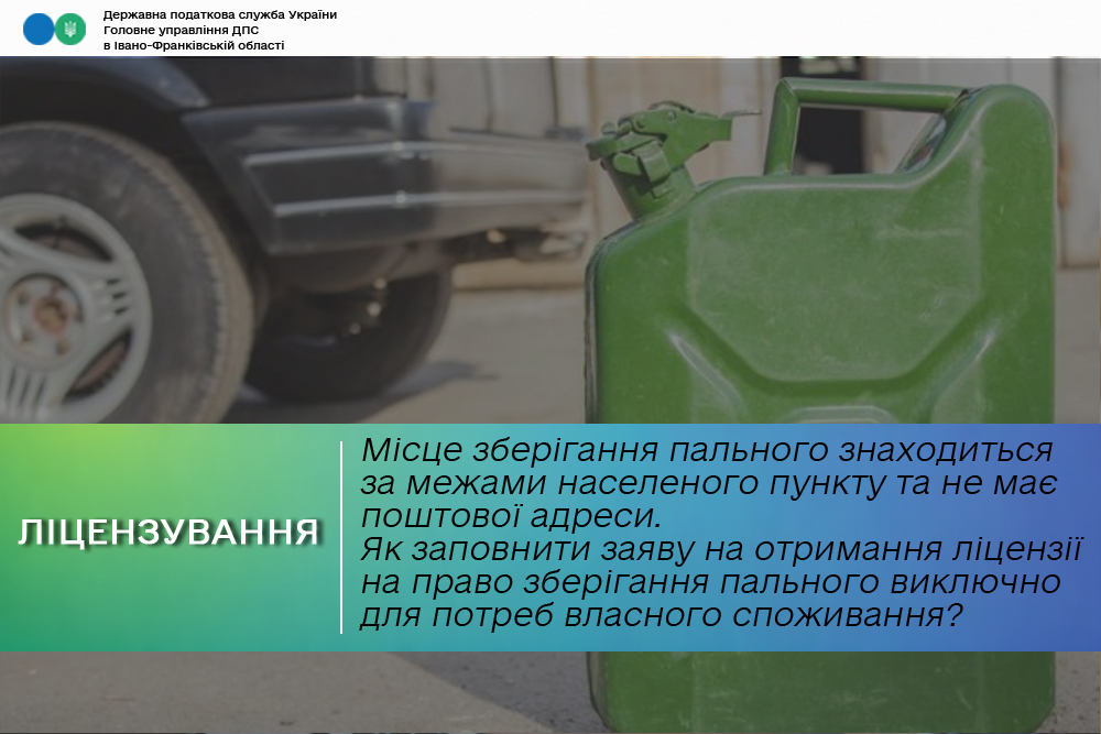 Отже, у разі відсутності поштової адреси, на якій зберігається пальне у п. 7 «Адреса місця зберігання пального» заяви на отримання ліцензії на право зберігання пального виключно для потреб власного споживання та/або промислової переробки зазначається кадастровий номер земельної ділянки де зберігається таке пальне ідентифікатор об’єкта оподаткування, код адміністративно-територіальної одиниці або території територіальної громади згідно з Кодифікатором.
