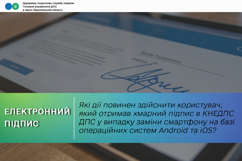 У випадку заміни смартфону на базі операційних систем Android та iOS користувачу, у якого наявний кваліфікований електронний підпис, що зберігається у «Хмарному сховищі» Кваліфікованого надавача електронних довірчих послуг Державної податкової служби України (далі – Надавач), потрібно звернутися до одного з представництв Надавача із необхідним переліком документів для отримання нового електронного підпису.