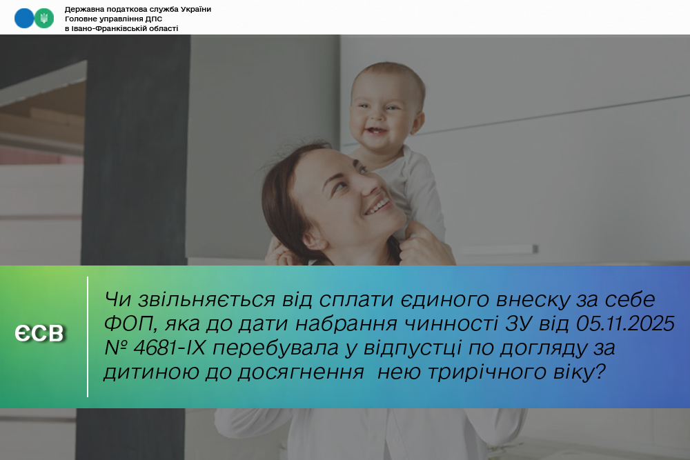 Враховуючи викладене, у разі якщо до дати набрання чинності Законом № 4681 фізична особа – підприємець перебувала у відпустці по догляду за дитиною до досягнення нею трирічного віку, то така фізична особа – підприємець звільняється від сплати єдиного внеску за себе з 01.10.2025 (незалежно від наявності / відсутності доходу, обраної системи оподаткування та дати початку / дати кінця отримання допомоги) за місяці звітного періоду, за які роботодавцем сплачується за таку особу єдиний внесок у розмірі не меншому від мінімального страхового внеску.