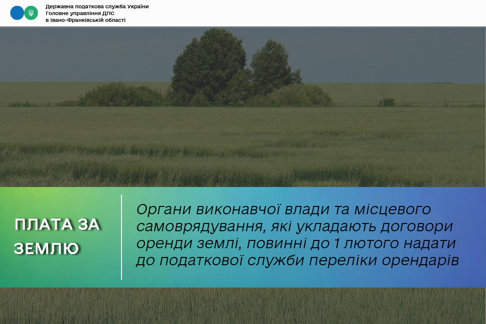 Органи виконавчої влади та органи місцевого самоврядування, які укладають договори оренди землі, повинні до 1 лютого надати контролюючому органу за місцезнаходженням земельної ділянки переліки орендарів, з якими укладено договори оренди землі на поточний рік та інформувати відповідний контролюючий орган про укладення нових, внесення змін до існуючих договорів оренди землі та їх розірвання до 1 числа місяця, що настає за місяцем, у якому відбулися зазначені зміни (п.288.1. ст.288 Податкового кодексу).
