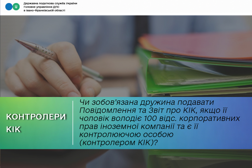 Чи є дружина контролюючою особою та чи зобов’язана подавати Повідомлення про КІК та Звіт про КІК, якщо її чоловік володіє 100 відс. корпоративних прав іноземної компанії та є її контролюючою особою (контролером КІК)?