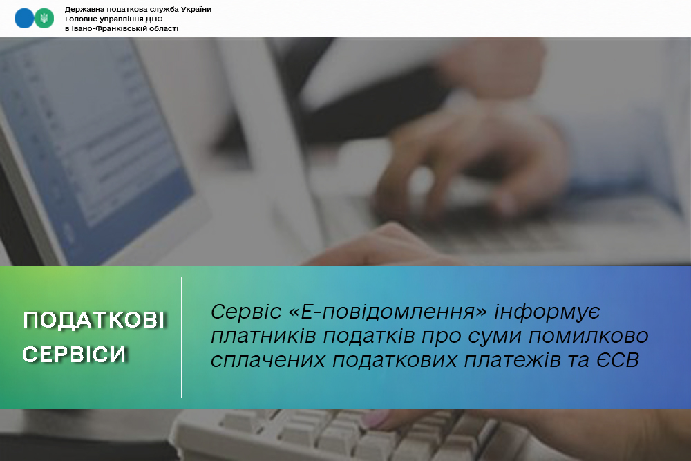 В Головному управлінні ДПС в Івано-Франківській області нагадують, що Державною податковою службою України впроваджено сервіс «Е-повідомлення» для підвищення рівня інформування платників податків про суми помилково сплачених податкових платежів та єдиного внеску. Автоматична відправка електронних інформаційних повідомлень про помилкову сплату платежів здійснюється засобами ІКС ДПС о 9.00 годині, в робочі дні, крім понеділка, за транзакціями про сплату за попередній банківський день.