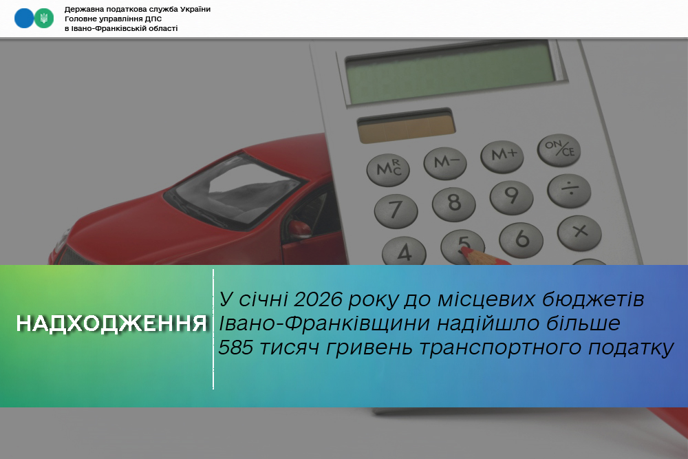 У січні 2026 року до бюджетів територіальних громад Івано-Франківщини надійшло 585,2 тисяч гривень транспортного податку, що на 182,2 тисячі гривень більше порівняно з надходженнями за січень минулого року. Про це повідомили в Головному управлінні ДПС в Івано-Франківській області.