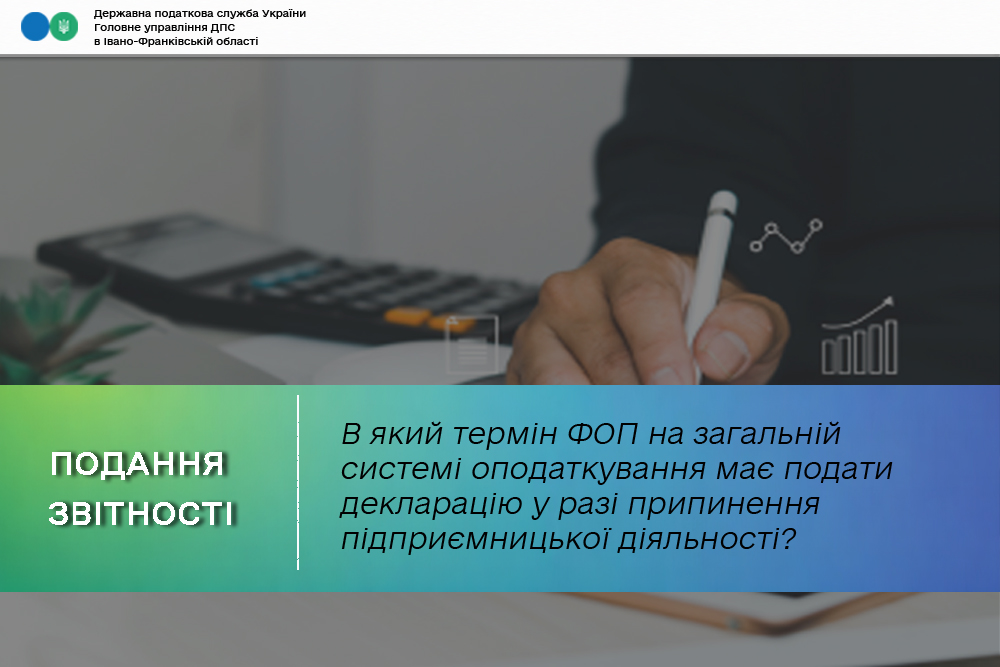 Фізична особа – підприємець на загальній системі оподаткування подає податкову декларацію про майновий стан та доходи протягом 20 календарних днів, що настають за останнім календарним днем місяця, в якому проведено державну реєстрацію припинення підприємницької діяльності та сплачує податок на доходи фізичних осіб протягом 10 календарних днів, що настають за останнім днем граничного строку подання такої декларації.