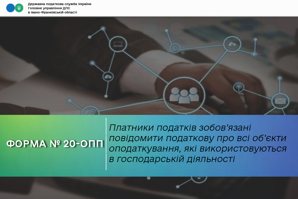 Крім того, платники зобов’язані повідомити податкову службу про всі наявні об’єкти оподаткування, та об’єкти, пов’язані з оподаткуванням. Для цього їм слід подати повідомлення за формою 20-ОПП. В даному документі слід вказати як власні, так і орендовані об’єкти. Це земельні ділянки, нерухоме та рухоме майно, офісні, складські, виробничі приміщення, транспорт, місця продажу товарів тощо. Звертаємо увагу, що місця торгівлі магазини, кафе, тощо слід зазначати ще й тому, що відображення інформації про них є необхідною умовою для реєстрації РРО.