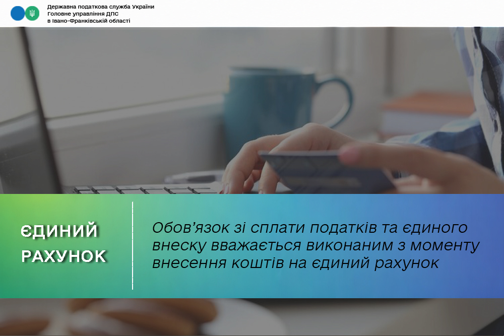 В Головному управлінні ДПС в Івано-Франківській області повідомляють платникам податків, що перехід на єдиний рахунок значно спрощує сплату податків, зборів та єдиного внеску. Розраховуватись з бюджетом та фондами можливо одним платіжним документом на загальну суму. Обов’язок зі сплати податкових платежів та єдиного внеску вважається виконаним з моменту внесення коштів на єдиний рахунок.
