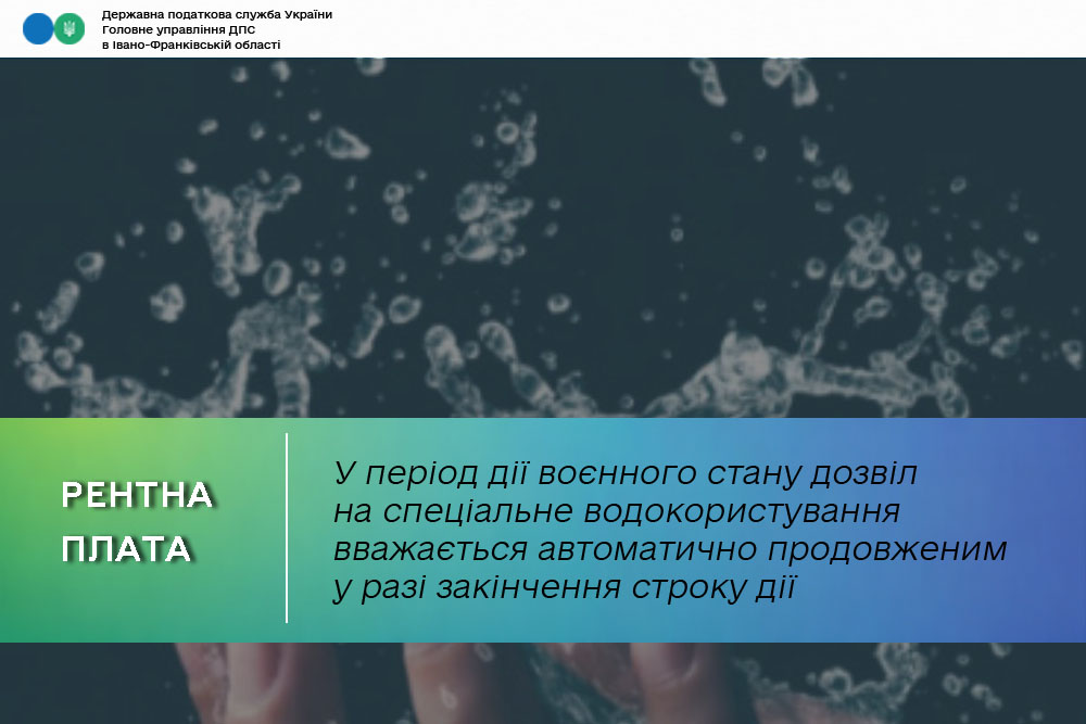 Відповідно дост. 255 Податкового кодексу України рентна плата за спеціальне використання води обчислюється виходячи з фактичних обсягів використаної води (підземної, поверхневої) водних об’єктів, встановлених у дозволі на спеціальне водокористування та/або в інтегрованому довкіллєвому дозволі, лімітів використання води, ставок рентної плати та коефіцієнтів. Про це нагадують в Головному управлінні ДПС в Івано-Франківській області.