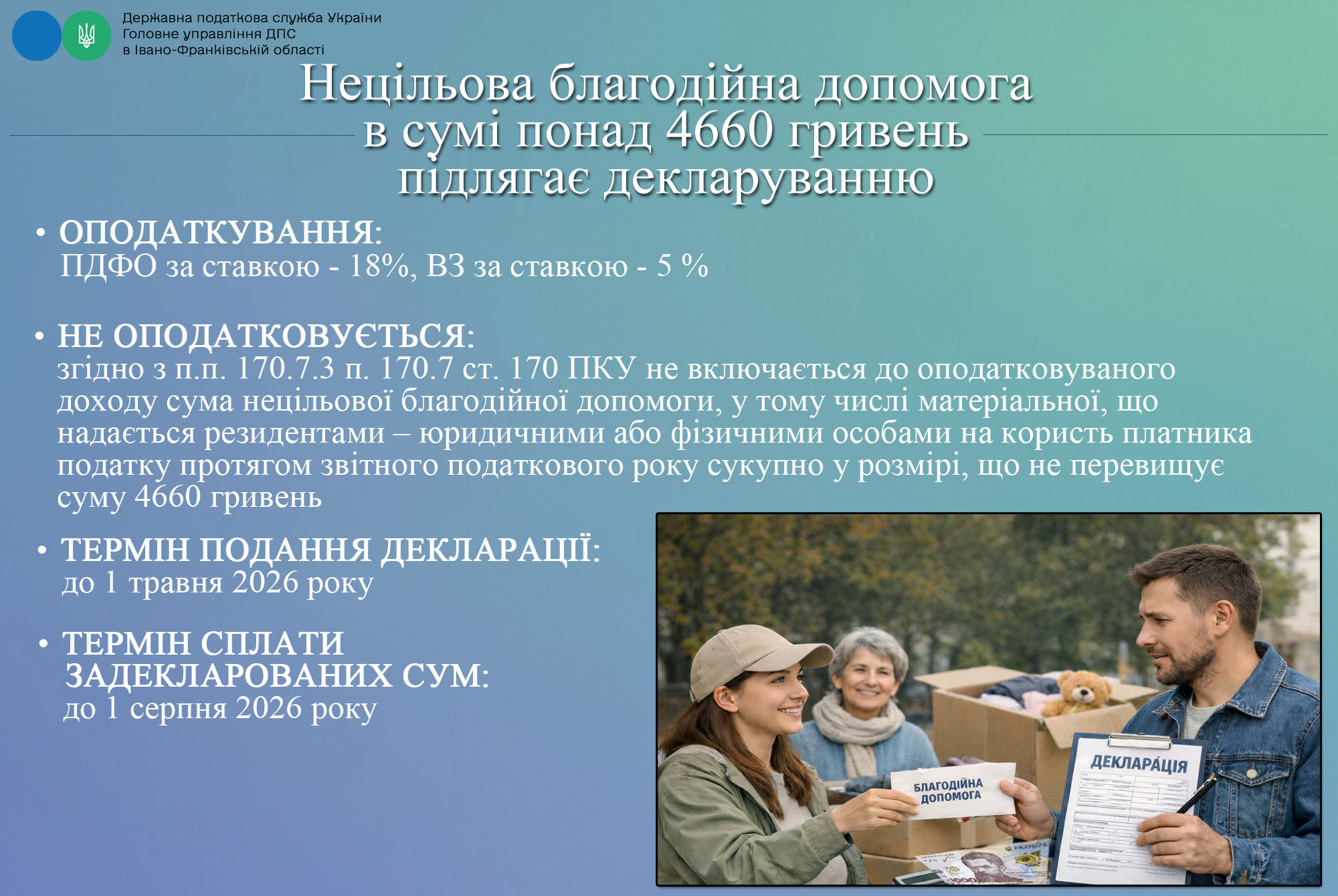 Деклараційна кампанія 2026: Нецільова благодійна допомога в сумі понад 4660 гривень підлягає декларуванню