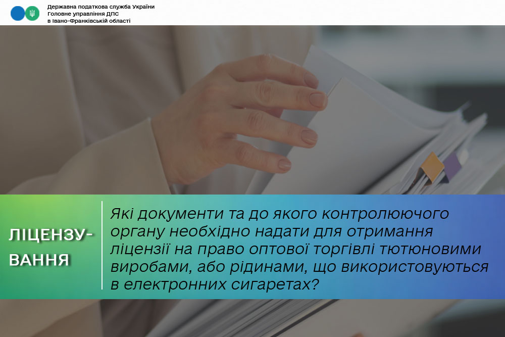 Згідно зі ст. 41 Закону України від 18 червня 2024 року № 3817-IX «Про державне регулювання виробництва і обігу спирту етилового, спиртових дистилятів, біоетанолу, алкогольних напоїв, тютюнових виробів, тютюнової сировини, рідин, що використовуються в електронних сигаретах, та пального» ліцензії на право оптової торгівлі, зокрема, тютюновими виробами, або рідинами, що використовуються в електронних сигаретах надаються та їхня дія припиняється органами ліцензування – територіальними органами центрального органу виконавчої влади, що реалізує державну податкову політику.
