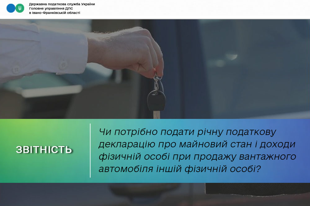 Враховуючи викладене, фізична особа – резидент (продавець) під час оформлення договору відчуження іншій фізичній особі рухомого майна у вигляді вантажного автомобіля в органі, який здійснює реєстрацію (перереєстрацію) транспортних засобів або через товарну біржу, зобов’язана самостійно сплатити до бюджету за своєю податковою адресою податок на доходи фізичних осіб з доходу від продажу такого майна та подати Декларацію за відповідний звітний рік до 01 травня року, що настає за звітним.