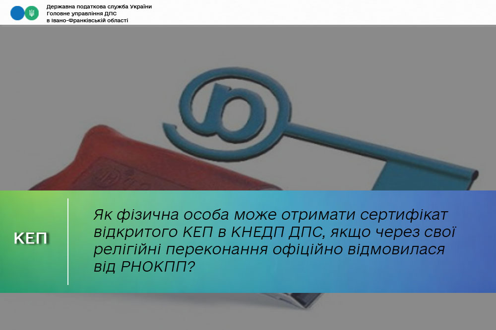 Якщо через релігійні переконання фізична особа відмовилась від реєстраційного номера облікової картки платника податків, такій особі потрібно додатково з документами, необхідними для отримання кваліфікованих електронних довірчих послуг, подати копію сторінки паспорта з відміткою про таку відмову. Про це повідомляють в Головному управлінні ДПС в Івано-Франківській області.