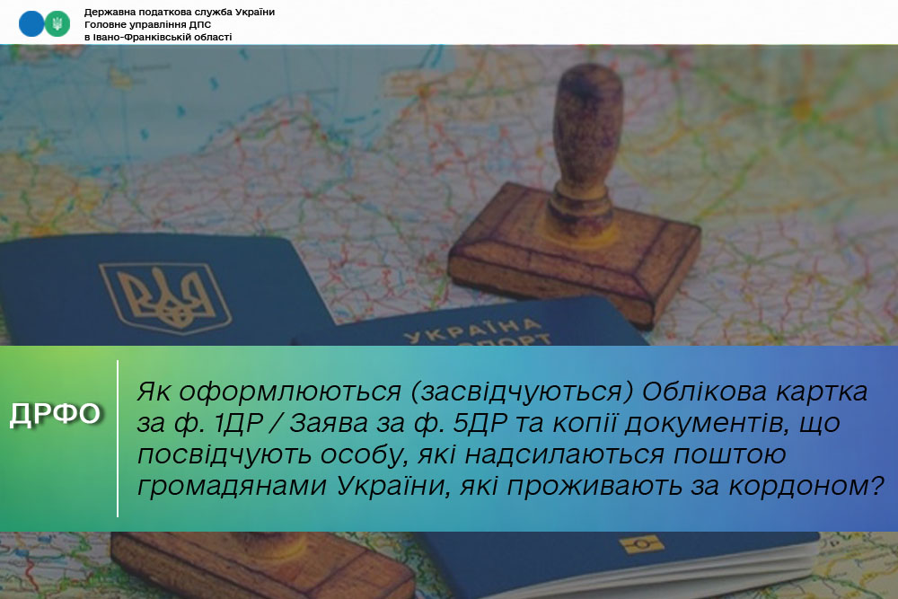 Громадяни України, які проживають або перебувають за кордоном та не можуть прибути до відповідного контролюючого органу в Україні, у разі необхідності реєстрації / внесення змін до ДРФО та/або отримання документа, що засвідчує реєстрацію фізичних осіб у ДРФО, можуть надіслати поштою на адресу ДПС облікову картку фізичної особи – платника податків за формою № 1ДР (додаток 2 до Положення № 822) / Заяву про внесення змін до ДРФО (додаток 12 до Положення № 822) та ксерокопію з чітким зображенням документа, що посвідчує особу (для громадян України: паспорт громадянина України; паспорт громадянина України для виїзду за кордон; тимчасове посвідчення громадянина України).
