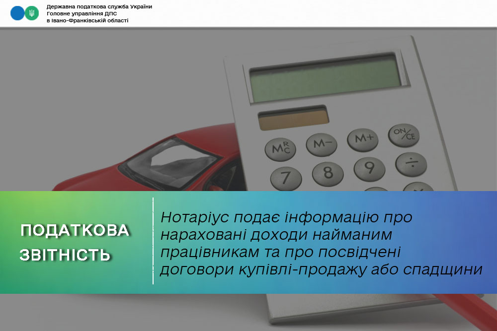 Відповідно до норм Податкового кодексу України державний нотаріус щомісяця, а приватний нотаріус щокварталу подають до контролюючого органу за місцем розташування державної нотаріальної контори або робочого місця приватного нотаріуса інформацію про посвідчені державним нотаріусом протягом звітного місяця, а приватним нотаріусом протягом звітного кварталу (з розбивкою по місяцях звітного кварталу) договори купівлі-продажу (міни) між фізичними особами та про видачу свідоцтв на право на спадщину. Про це нагадують в Головному управлінні ДПС в Івано-Франківській області.