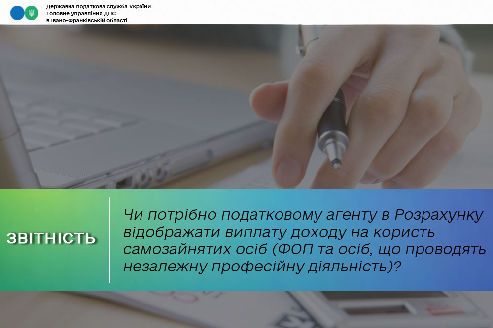 Враховуючи викладене, податковий агент у разі нарахування (виплати) доходів на користь самозайнятих осіб (фізичних осіб – підприємців та осіб, які провадять незалежну професійну діяльність) зобов’язаний подавати податкову звітність контролюючому органу, зокрема Розрахунок, незалежно від того, що ПКУ передбачено звільнення податкового агента від обов’язку нарахування і сплати податку на доходи фізичних осіб та військового збору з зазначених доходів, за умови надання самозайнятою особою копії документів, що підтверджують його державну реєстрацію відповідно до закону як суб’єкта підприємницької діяльності (довідки про взяття на податковий облік як фізичної особи, яка провадить незалежну професійну діяльність), а також у разі необхідності витягу з реєстру платників єдиного податку.