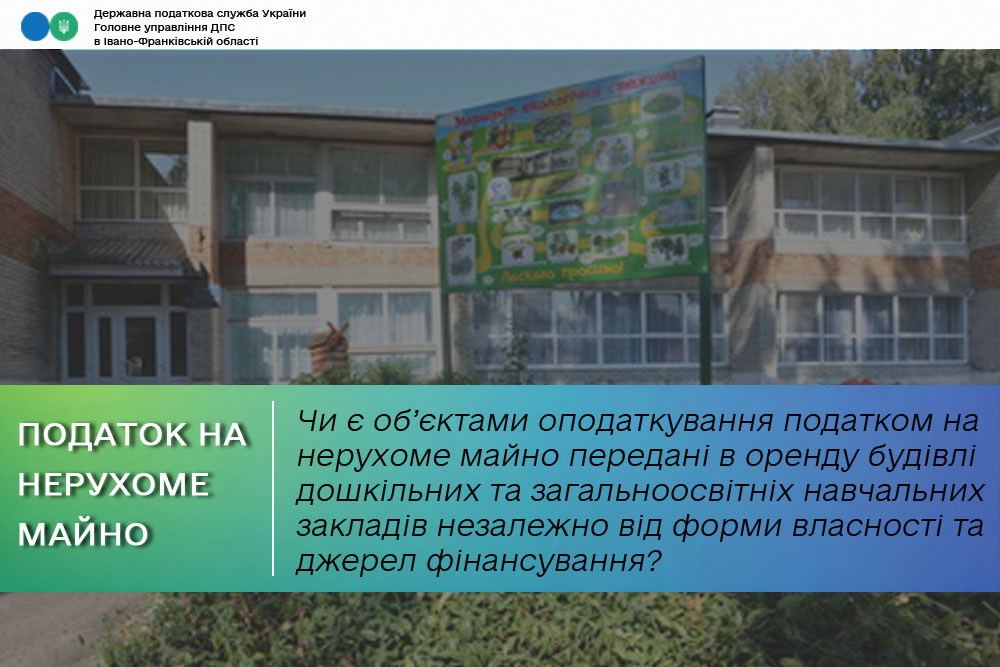 Пунктом «і» п.п. 266.2.2 п. 266.2 ст. 266 ПКУ з об’єктів оподаткування податком на нерухоме майно, відмінне від земельної ділянки, виключено будівлі дошкільних та загальноосвітніх навчальних закладів незалежно від форми власності та джерел фінансування, що використовуються для надання освітніх послуг.